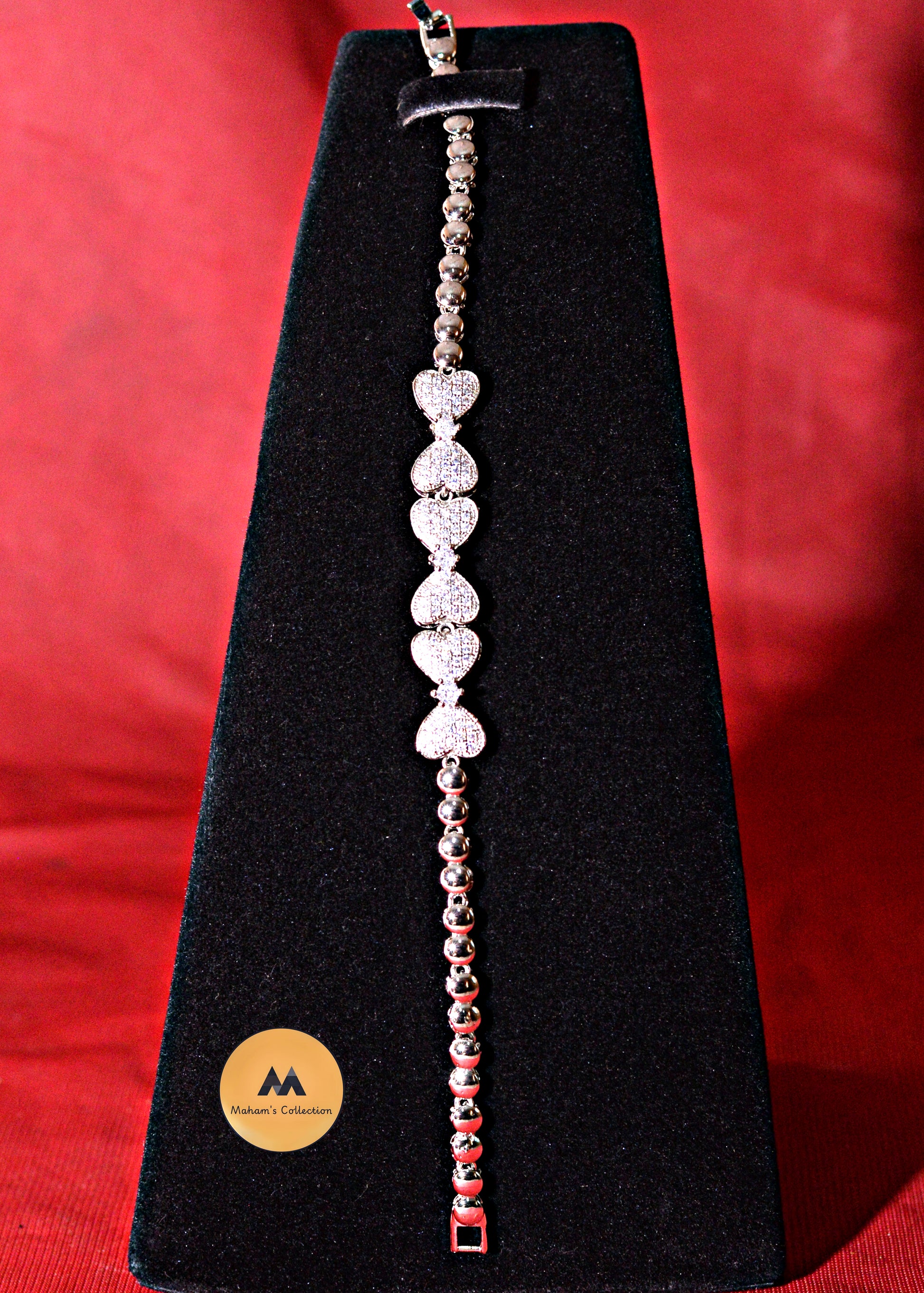 Show your love with the gorgeous Brilliant Pave Heart Beaded Bracelet from Maham's Collection. This captivating piece showcases a central sequence of exquisitely crafted hearts, each completely covered in dazzling pave-set crystals for maximum shimmer. The sparkling hearts are elegantly framed by a smooth, polished silver-tone beaded chain, creating a beautiful contrast. Its free-size design ensures a comfortable fit, making it a perfect symbol of affection for yourself or someone special.